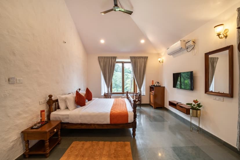 Experience the charm of Malnad architecture with our spacious Hilltop Cottages, offering panoramic views of the Western Ghats. Surrounded by lush coffee plantations, these cottages are ideal for a peaceful nature retreat with modern comforts an private balcony